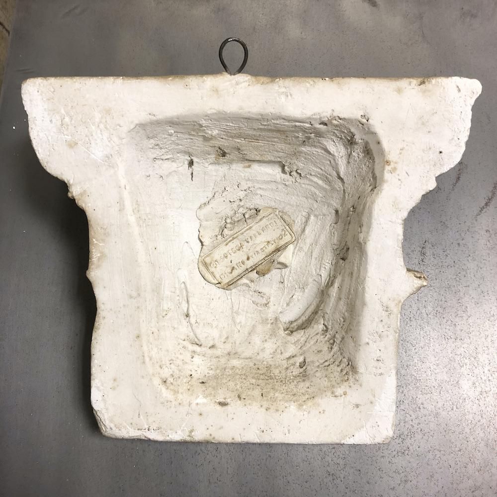 Antico capitello in gesso risalente ai primi anni del ‘900, riportante sul retro il marchio di fabbrica della gipsoteca d’origine: Gipsoteca Vallardi – Milano Via Stelvio 2.